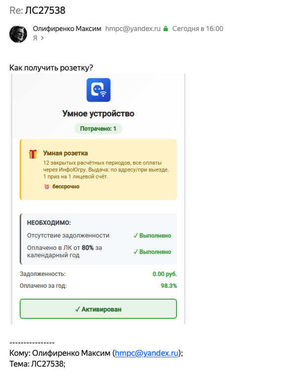 Заявку создаю в связи с тем, что она не создалась через кабинет. Пользователь активировал купон в январе 2025.